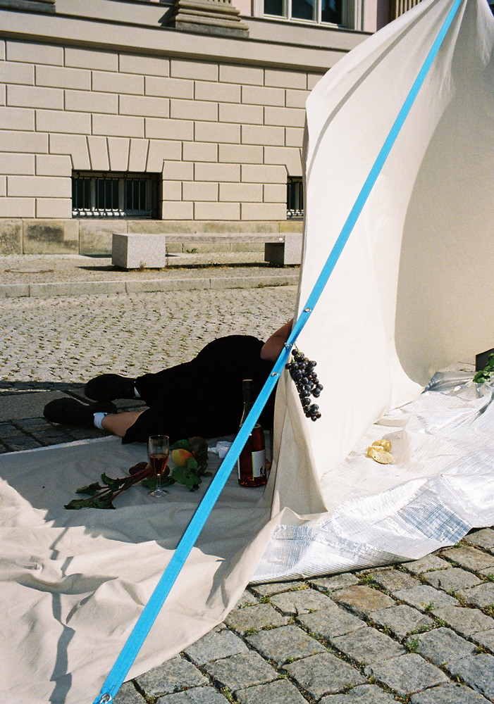 Me and Greta created a structure that allows us to appropriate a piece of Berlin and have a direct link between urban and personal scales. Installation of the textile element and the use of it became a performative action. We thought of how this action would be perceived by other participants of urban life. Somehow no one was bothered or provoked by our installation. And it felt very organic to stay within the room we created. It provided us with a shadow and a surface to enjoy the sun. This very personalized bubble made us feel more connected to Berlin.